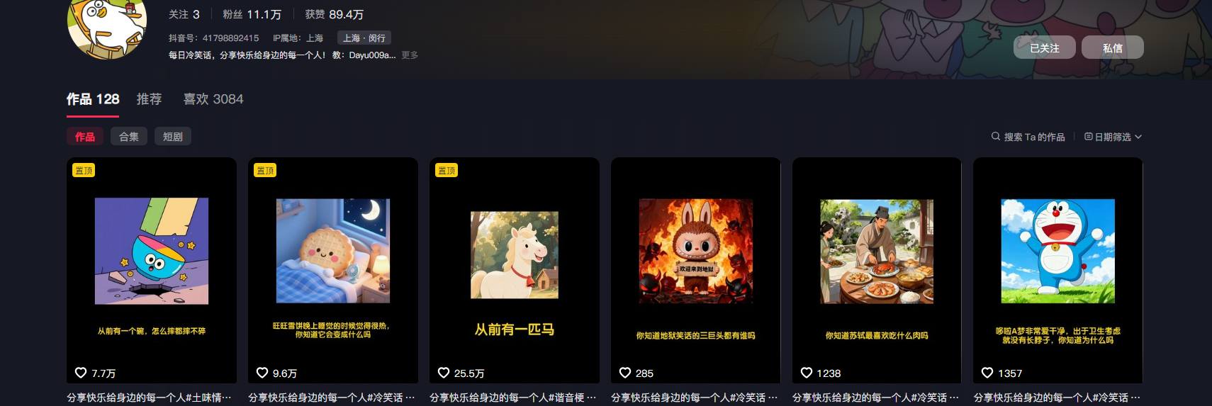 这类视频特简单:靠谐音梗、改编俗语玩反转,10 秒就能讲完一个笑话,主打一个 “给用户图一乐”。
