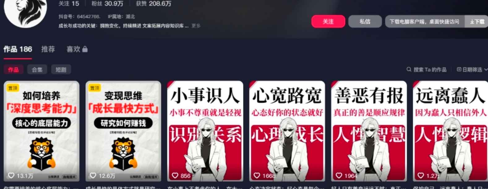 太香了吧!思维导图认知成长视频居然这么受欢迎!比如最近发现的这个博主:186个作品,30.9万粉丝,280.6万获赞。